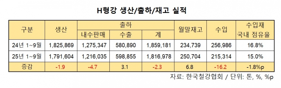 이에 따라 올 1~3분기 국내 H형강 수요(내수 판매+수입)는 143만1,000톤으로 전년 동기 대비 6.6% 감소한 것으로 나타났다.