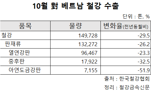 한국철강협회 통계에 따르면, 10월 한국의 대(對) 베트남 철강 수출은 약 15만 톤으로 지난해 같은 달과 비교해 29.5% 줄었다. 지난해 3월(-27.2%) 이후 1년7개월 만에 처음으로 전년동월대비 감소했고, 2023년 1월(29.7%) 이후 가장 큰 감소폭을 나타냈다.