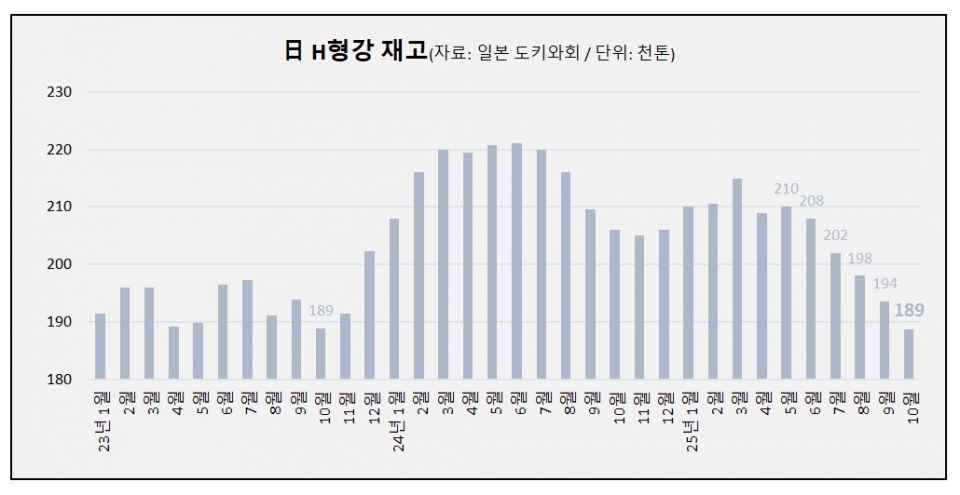 한편, 일본제철 H형강 유통사 모임 도키와회(ときわ会)에 따르면 지난 10월 말 전국 유통 재고는 18만8,600톤으로 전월 대비 2.5%(4,900톤) 줄면서 5개월 연속 감소했다.