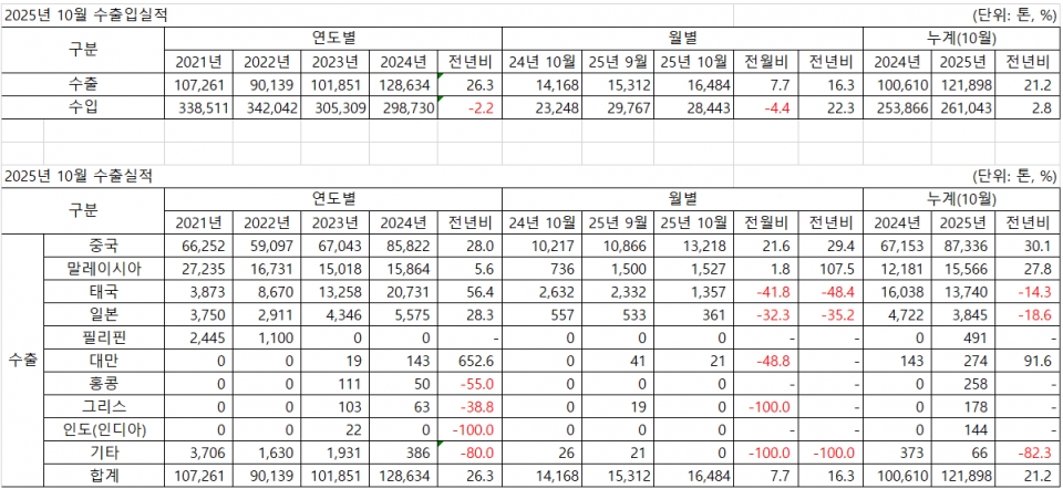 특히 중국향 쏠림이 뚜렷하다. 10월 중국 수출은 1만3,218톤으로 전년 동월 대비 29.4% 증가했다. 2025년 누적 기준 8만7,336톤으로 전년 대비 30.1% 늘었으며 전체 수출의 약 72%를 차지한다. 말레이시아도 1만5,566톤으로 27.8% 증가하는 등 동남아 지역으로의 유출도 확대되고 있다. 다만 태국과 일본 등 일부 국가로의 수출은 감소했으나 중국·말레이시아 중심의 수출 확대가 전체 증가세를 충분히 견인하고 있다.