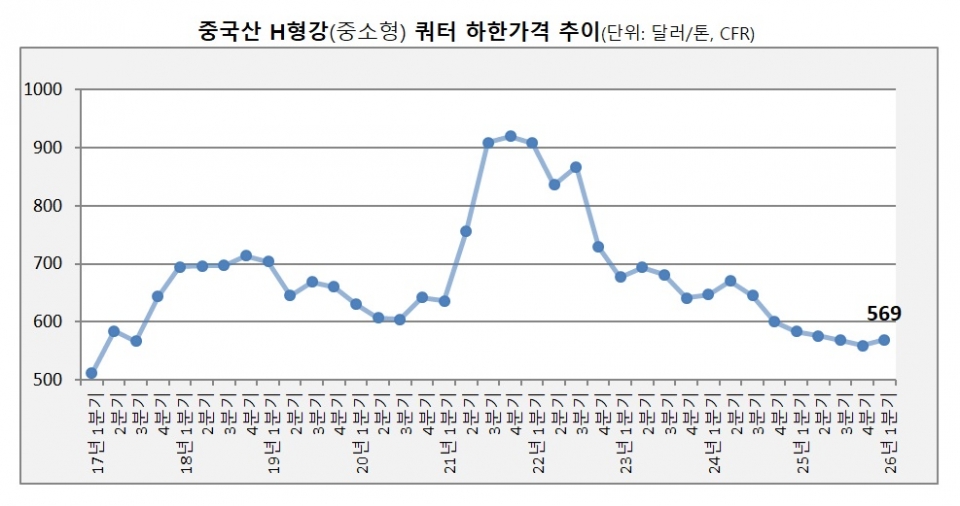 업계에 따르면 내년 1분기(1~3월) 중국산 중소형 H형강 쿼터 하한가격은 전분기 대비 10달러 상승한 톤당 569달러(CFR)로 책정됐다. 무려 7개 분기 만에 첫 반등이다.