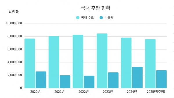 철강업계에 따르면 올해 국내 후판 시장 흐름은 ‘버티기’로 요약된다. 국내 후판 수요는 2023년 844만 톤으로 고점을 기록한 이후 감소세로 돌아서 2024년에는 780만 톤 수준으로 줄었고, 더욱이 올해 수요는 757만 톤 안팎으로 낮아질 것으로 추정된다.