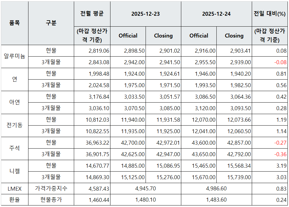 [표] LME 비철금속 및 환율 동향(12월 23일)