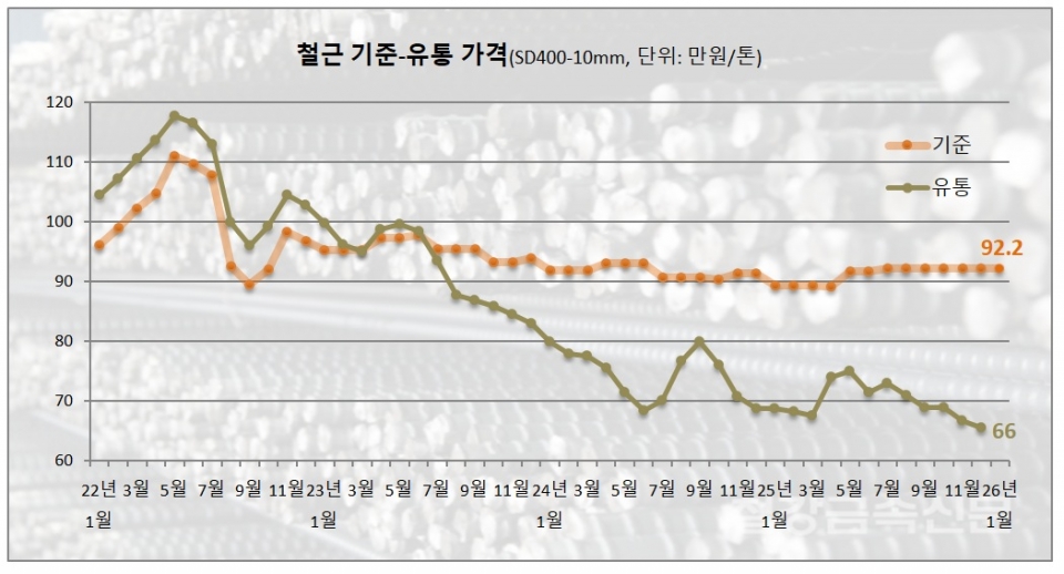철근 기준가격은 9개월 연속 90만원대를 유지하고 있으나 유통시세는 여전히 60만원 중후반대에 머무르며 좀처럼 격차를 좁히지 못하는 모양새다.