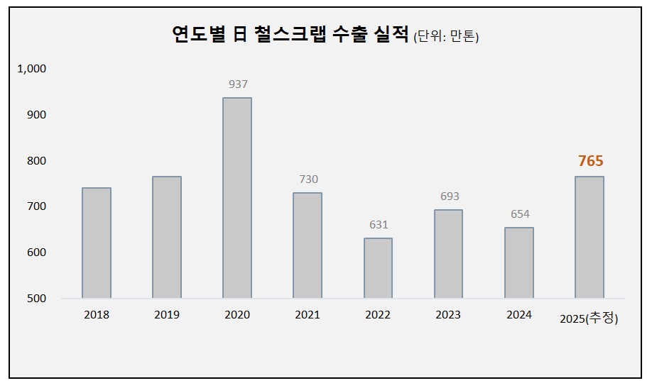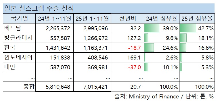 올 1~11월 日 철스크랩 수출 전년比 21%↑
