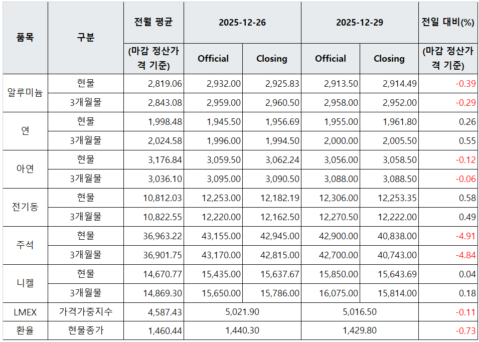 [표] LME 비철금속 및 환율 동향(12월 29일)