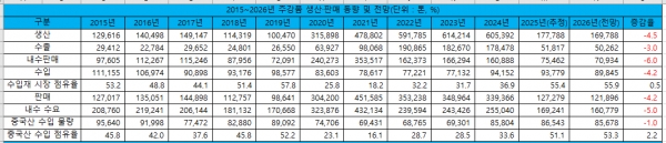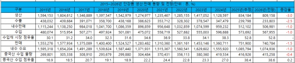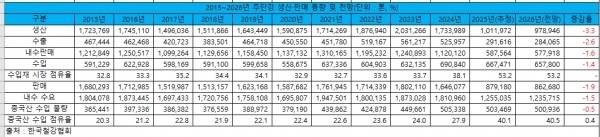 ■ 2026년 주단강 생산·내수판매·수출·수입 각 전년比 3.3%·1.6%·2.6%·1.4% 감소중국산 수입재 시장 점유율은 상승, 첨단산업 분야 신수요 개발 및 신시장 개척 필요