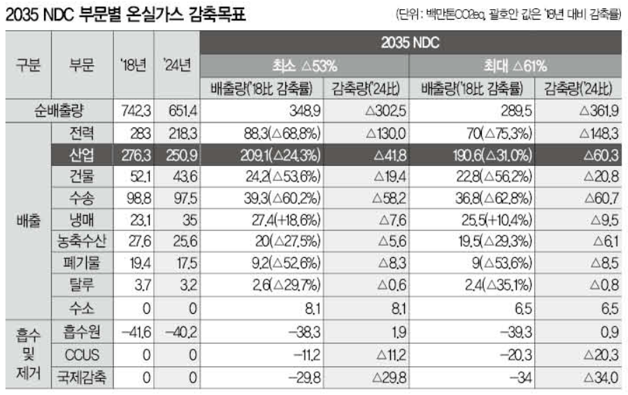 산업부문 감축목표는 2018년 대비 24.3(하한)~31(상한)% 감축하는 수준으로 정해졌다. 이에 따라 2035년 산업 부문의 순배출량은 하한선에선 2억 910만 톤, 상한선에선 1억 9,060만 톤을 달성해야 한다.