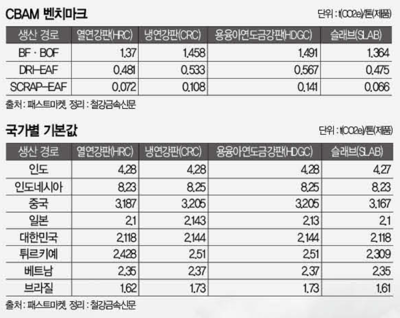 제품별 벤치마크값은 알려진 것처럼 제강 경로별로 다르게 책정됐다. 대표적으로 HRC는 △고로·전로 1.370t(CO2e)/톤 △직접환원철(DRI)-전기로 0.481t(CO2e)/톤 △고철-전기로 0.072t(CO2e)/톤으로 설정됐다.