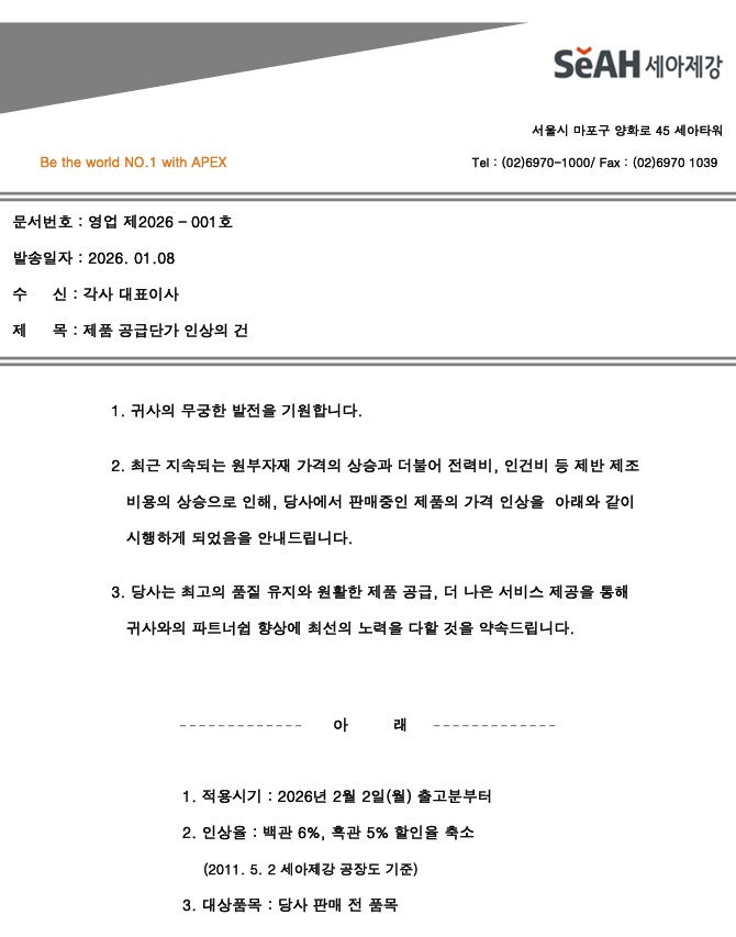 회사측에 따르면 최근 지속되는 원부자재 가격의 상승과 더불어 전력비, 인건비 등 제반 제조 비용의 상승으로 제품 가격 인상을 단행하게 됐다고 밝혔다. 이에 2월 2일 출고분부터 백관 6%, 흑관 5% 제품 할인율을 축소할 계획이다.