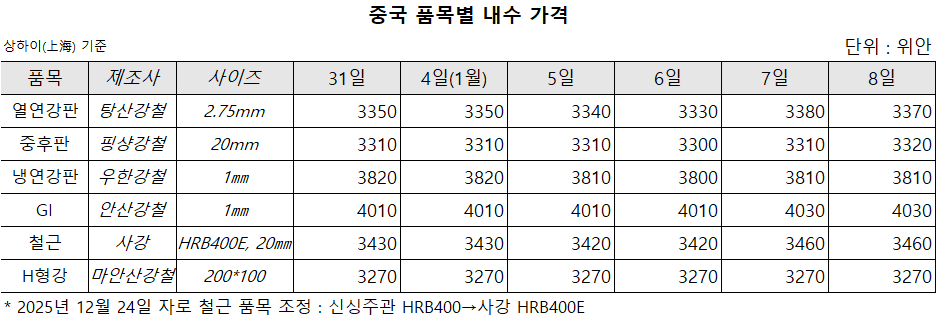 8일(현지시각) 스틸홈 일일 중국 철강 가격 통계에 따르면, 주요 6품목 가격은 톤당 △열연강판 3,370위안 △중후판 3,320위안 △냉연강판 3,810위안 △용융아연도금강판 4,030위안 △철근 3,460위안 △H형강 3,270위안을 기록했다. 일주일 전과 비교해 냉연강판 가격이 톤당 10위안 하락하고, H형강 가격은 변화가 없었던 가운데, 나머지 품목은 10~30위안 범위의 오름폭을 나타냈다.