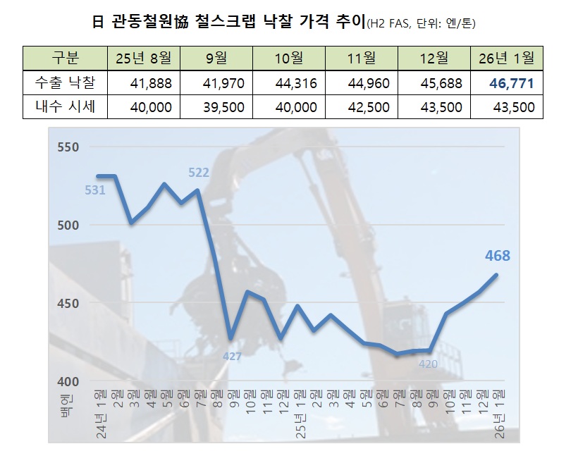 9일 업계에 따르면 이날 일본 관동철원협동조합이 진행한 1월 철스크랩 수출 입찰에서 H2 낙찰 가격은 톤당 4만6,771엔(FAS)으로 전월 대비 1,083엔 오르며 6개월 연속 상승했다.