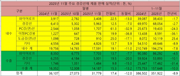 2025년 1~11월 경강선재 판매 전년比 8.9% 감소