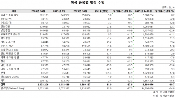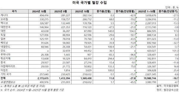 한편, 직전 1년간(2024년 11월~2025년 10월) 미국이 가장 철강을 많이 수입한 국가는 캐나다(28만2천 톤)였고, 브라질(26만7천 톤), 멕시코(14만 톤), 한국(11만6천 톤), 대만(8만7,100톤)이 그 뒤를 이었다. 이들 국가로부터의 10월 수입은 대만을 제외하고 모두 전년동월대비 두 자릿수 감소율로 줄었다.