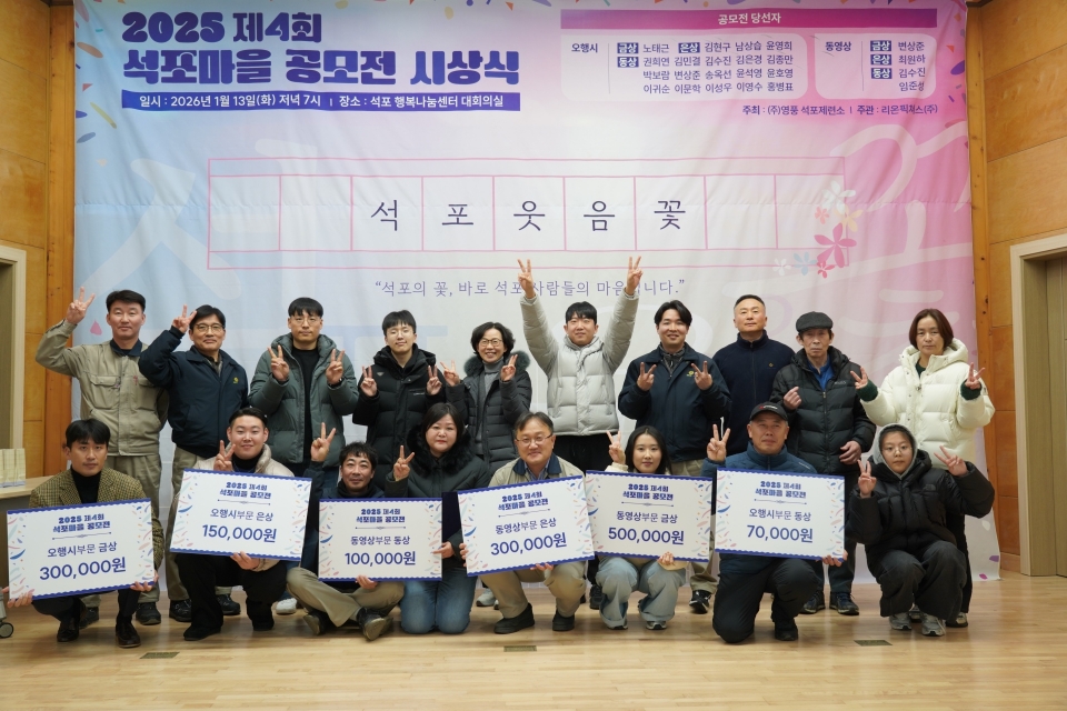 2026년 1월 13일 경상북도 봉화군 석포면 석포 행복나눔센터에서 열린 ‘제 4회 석포마을 공모전 시상식’에서 수상자와 석포제련소 관계자들이 기념사진을 찍고 있다./영풍 제공영풍 석포제련소가 13일 경북 봉화군 석포면 석포행복나눔센터 대회의실에서 ‘2025 석포마을 공모전’ 시상식을 열었다.