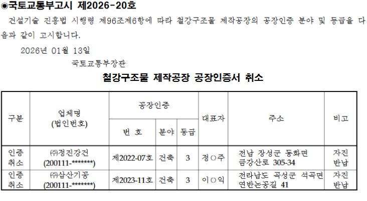 전라남도 자성군 소재 ‘정진강건’과 전라남도 곡성군 소재 ‘삼산기공’이 철강구조물 제작공장 인증서를 정부에 자진 반납했다.