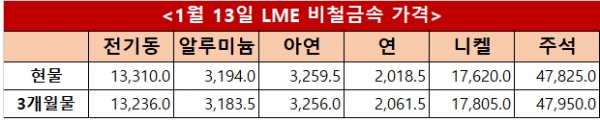런던금속거래소(LME)에서 13일(현지시간) 기준 비철금속 가격은 혼조세로 마감했다. 전기동 현물과 3개월물은 각각 톤당 13,310달러와 13,236달러를 기록했으며, 알루미늄은 3,194달러와 3,183.5달러, 아연은 3,259.5달러와 3,256달러로 집계됐다. 연은 2,018.5달러와 2,061.5달러, 니켈은 17,620달러와 17,805달러, 주석은 47,825달러와 47,950달러를 나타냈다.