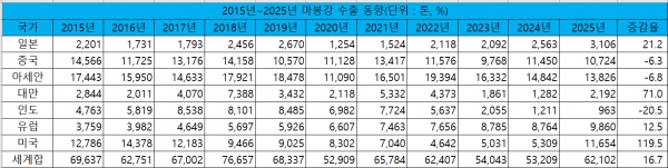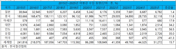 2025년에는 마봉강 수입 또한 5만1,272톤으로 전년 대비 15.7% 증가했다. 국가별로 미국산 수입은 279톤으로 전년 대비 41.3% 감소한 반면 일본과 중국, 아세안과 대만, 인도와 유럽산 수입은 각 6,782톤, 3만2,118톤, 680톤, 2,514톤, 6,172톤, 2,726톤으로 전년 대비 1.4%, 11.8%, 17.9%, 34.2%, 56.5%, 35.0% 증가했다.