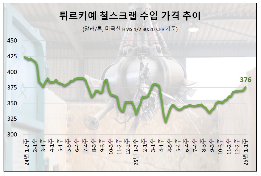 업계에 따르면 1월 둘째 주 튀르키예 철스크랩 수입 가격은 미국산 HMS(80:20) 기준 톤당 376달러(CFR)로 전주 대비 5달러 상승했다.