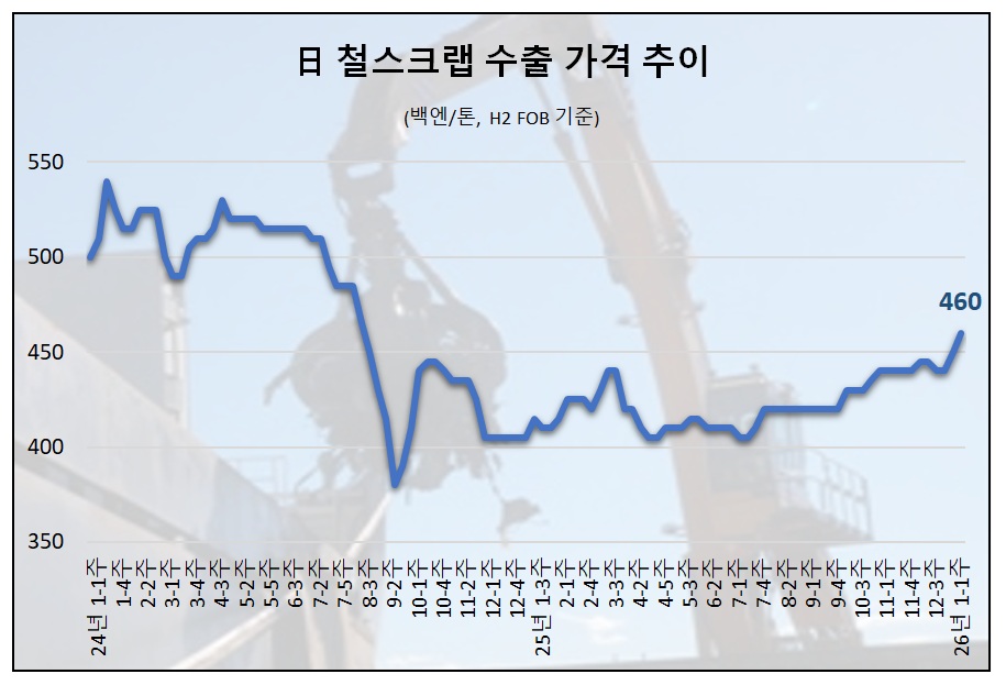 우리와 가까운 일본 시장 역시 엔화 약세와 운임 하락 영향으로 오름세를 보이고 있다. 지난주 일본 철스크랩 수출 시세는 H2 FOB 기준 톤당 4만5,000~4만6,000엔으로 전주 대비 1,000엔 상승했다. 재작년 8월 중순(4만5,500~4만6,500엔) 이후 17개월 만에 최고치다.