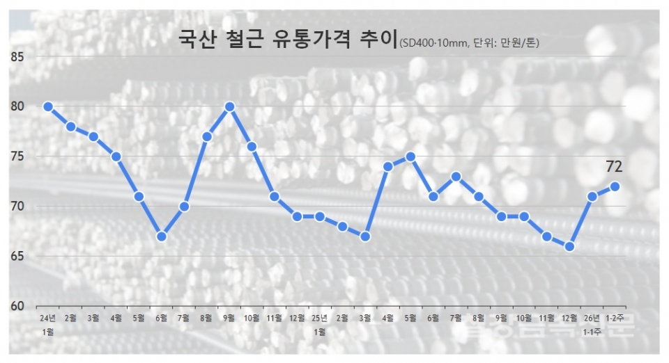 업계에 따르면 지난주 국산 철근 유통시세(SD400, 10mm)는 톤당 71~72만원으로 전주 대비 1만원 상승했다.
