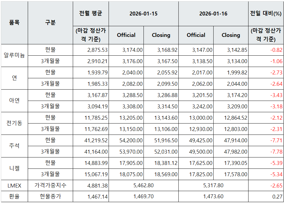 [표] LME 비철금속 및 환율 동향(1월 16일)
