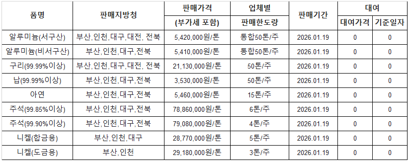 - ■ [표] 조달청 방출 가격(1월 16일)