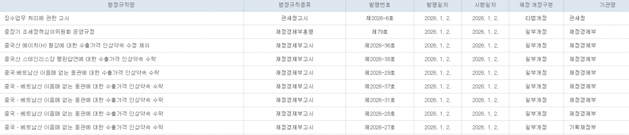 정부는 1월 2일자부로 철강·금속 관련 관세 시행령을 개정했다고 밝혔다. 해당하는 건은 ‘중국·인도네시아 및 대만산 스테인리스강 평판압연에 대한 덤핑방지관세 부과에 관한 규칙’, ‘중국산 탄소강 및 그 밖의 합금강 열간압연 후판에 대한 덤핑방지관세 부과에 관한 규칙’, ‘중국산 에이치(H) 형강에 대한 덤핑방지관세의 부과에 관한 규칙’, ‘중국·베트남산 이음매 없는 동관에 대한 덤핑방지관세 부과에 관한 규칙’ 등 4건이다.