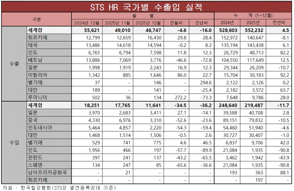 [표] 스테인리스강 열연광폭강대 2025년 12월 수출입