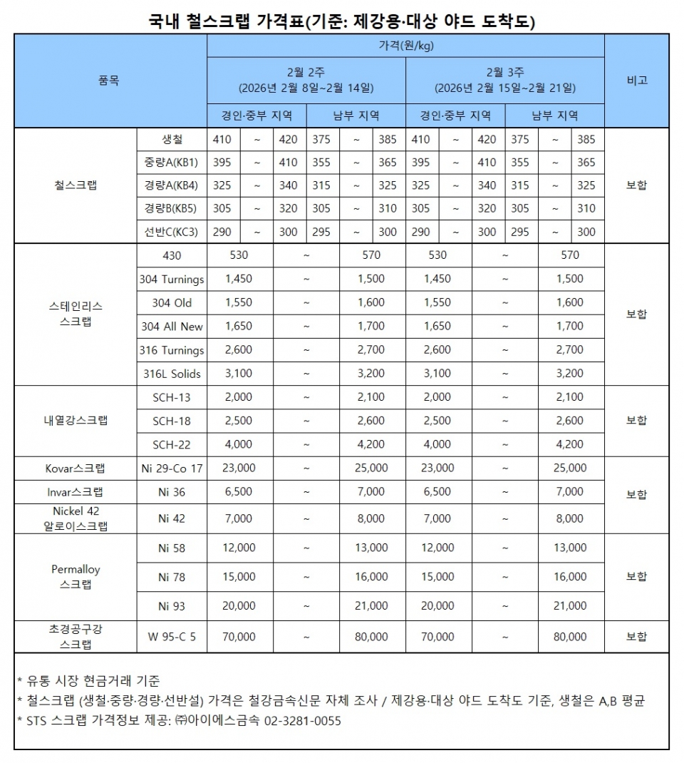 2월 셋째 주 경인·중부권과 남부권 철스크랩 가격은 대한제강과 YK스틸의 추가 인하 예고에도 큰 변동 없이 약보합세를 이어갔다.