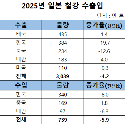 한편, 지난해 일본의 전철강 수입은 738만5천 톤으로 2024년 대비 5.9% 감소했다. 수입액은 87억2,500만 달러로 8.6% 줄었고, 평균 수입 단가도 톤당 1,181달러로 2.8% 하락했다.