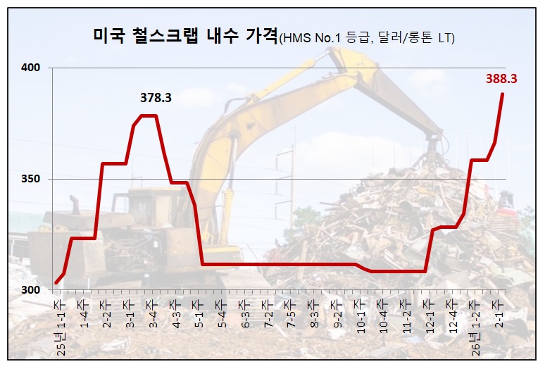 2월 둘째 주 미국 HMS No.1 등급 철스크랩 컴포짓 프라이스는 롱톤(LT)당 388.3달러로 전주 대비 22달러 급등하며 2주 연속 상승했다. 컴포짓 프라이스는 미국 동부 피츠버그, 시카고, 필라델피아에서 거래된 철스크랩 평균 가격이다.