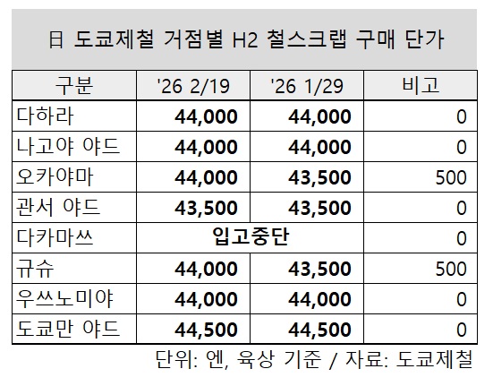 한편, 도쿄제철은 19일부로 오카야마, 규슈공장에서 철스크랩 구매 가격을 전 등급 톤당 500엔 인상한다고 밝혔다. 그 외 거점은 모두 동결을 이어간다.