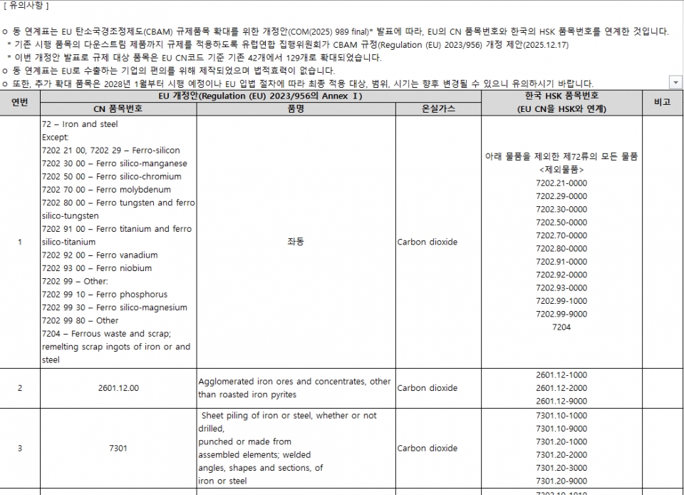첨부파일 : [별첨] EU CBAM 대상 확대 품목 한-EU 품목번호 연계표(28.1월 시행).xlsx