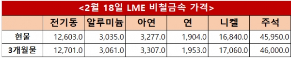 런던금속거래소(LME) 18일(현지시간) 기준 전기동 현물과 3개월물은 각각 톤당 12,603달러와 12,701달러를 기록했으며 알루미늄은 3,035달러와 3,061달러, 아연은 3,277달러와 3,307달러로 집계됐다. 연은 1,904달러와 1,953달러, 니켈은 16,840달러와 17,060달러, 주석은 45,950달러와 46,000달러를 나타냈다.
