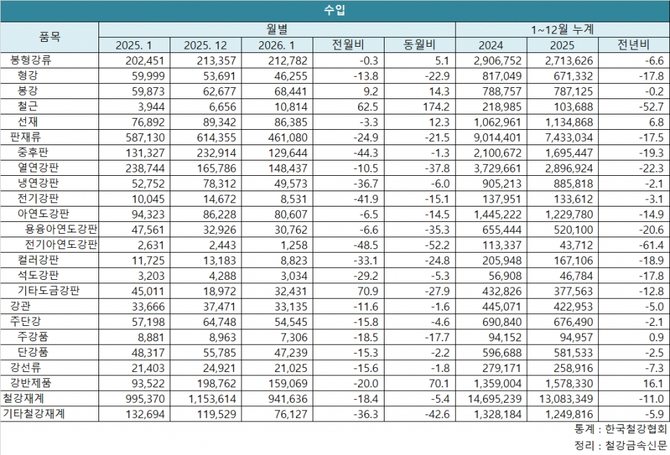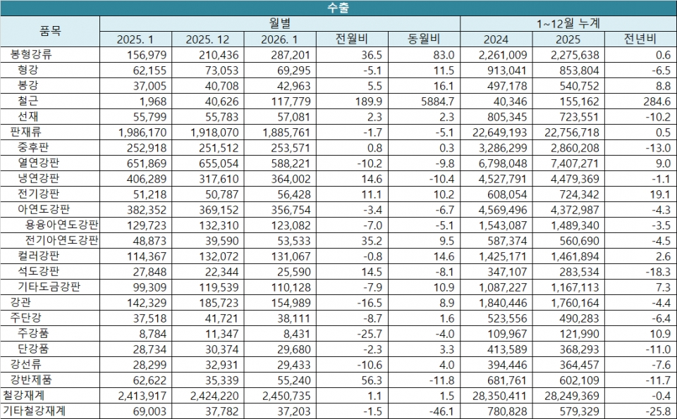 - ■ [표] 1월 열연강판 수출·수입 동반 감소