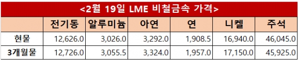런던금속거래소(LME) 19일(현지시간) 기준 전기동 현물과 3개월물은 각각 톤당 12,626달러와 12,726달러를 기록했으며 알루미늄은 3,026달러와 3,055.5달러, 아연은 3,292달러와 3,324달러로 집계됐다. 연은 1,908.5달러와 1,957달러, 니켈은 16,940달러와 17,150달러, 주석은 46,045달러와 45,925달러를 나타냈다.