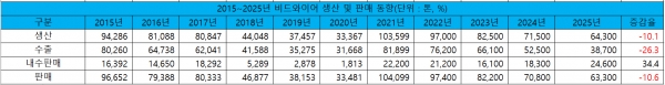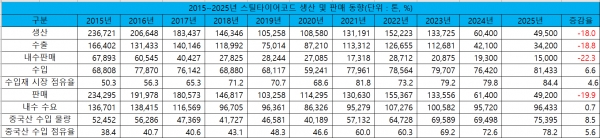 각종 대외 악재에도 전반적 품질 경쟁력 향상으로 국내 자동차산업은 호조를 보이고 있지만 섬유 등 대체소재 채택 확대, 중국 업체들의 저가 공세 및 품질 경쟁력 향상으로 인해 국내 스틸타이어코드와 비드와이어 생산기반이 갈수록 위축되고 있는 것으로 나타났다. 스틸타이어코드의 경우 2025년 자동차산업 호조로 국내 수요가 소폭 반등했음에도 생산 및 판매는 2015년 이후 최저 수준에 머무르며 5만 톤에도 미달했다. 그리고 비드와이어 또한 팬데믹 이후 5년 연속으로 판매가 감소했다.