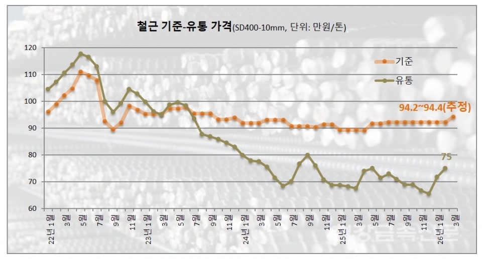 이달 철근 기준가격이 톤당 92만2,000원임을 감안하면 다음달 기준가격은 최소 94만원 이상으로 오르는 셈이다. 철근 기준가격이 94만원대를 회복하는 건 지난 2023년 12월(94만원) 이후 2년 3개월 만에 처음이다.