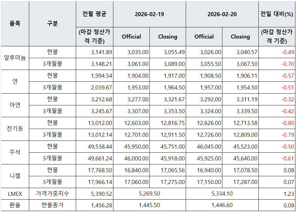 [표] LME 비철금속 및 환율 동향(2월 20일)