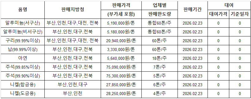 - ■ [표] 조달청 방출 가격(2월 12일)