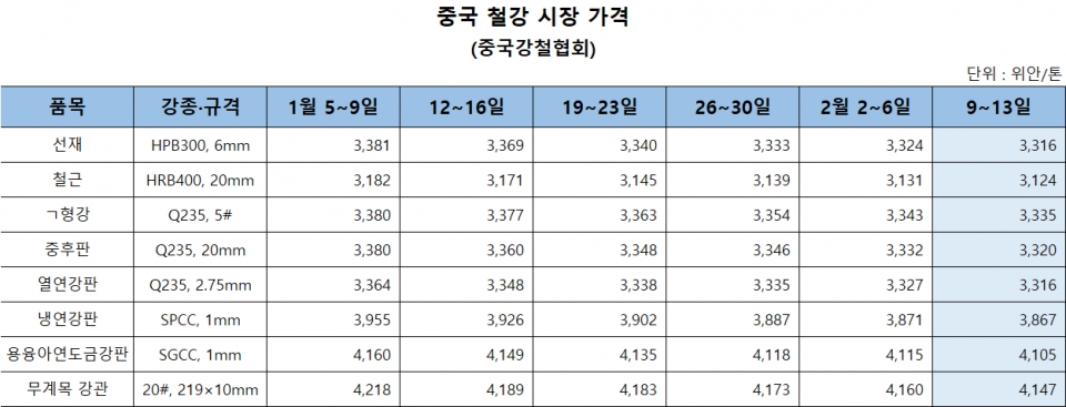 [오늘 중국은-표] 춘절 전 마지막 주 중국 철강價, 5주 연속 하락