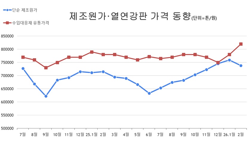 열연강판 유통가격이 2월 들어 상승 흐름을 이어가고 있다. 같은 기간 열연강판 제조원가는 소폭 조정을 받았지만, 그동안 높아졌던 원가 부담이 완전히 해소된 상황은 아니라는 평가가 나온다. 업계는 최근 가격 흐름을 누적된 원가 상승분이 시장에 반영되는 과정으로 보고 있다.