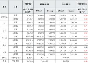 [표] LME 비철금속 및 환율 동향(2월 23일)