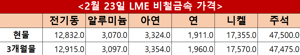 런던금속거래소(LME) 23일(현지시간) 기준 전기동 현물과 3개월물은 각각 톤당 12,832달러와 12,915달러를 기록했으며, 알루미늄은 3,070달러와 3,097달러, 아연은 3,324달러와 3,354달러로 집계됐다. 연은 1,911달러와 1,960달러, 니켈은 17,355달러와 17,570달러, 주석은 47,500달러와 47,475달러를 나타냈다.