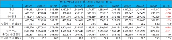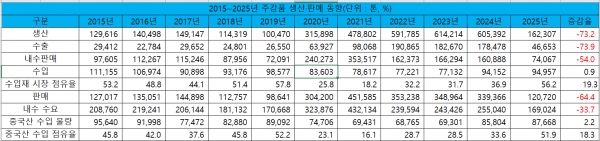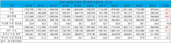 주강품, 2025년 생산·내수·수출 73.2%·54.0%·73.9% 감소 수입은 0.9% 증가국내 수요 팬데믹 이후 첫 20만 톤 미달하며 2015년 이후 최저, 중국산 점유율도 50%↑