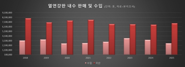 2025년 기준 국내 열연강판 전체 수요는 937만 톤이다. 수입은 254만 톤, 국산 판매는 683만 톤이다.