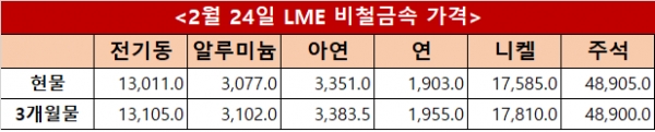 런던금속거래소(LME) 24일(현지시간) 기준 전기동 현물과 3개월물은 각각 톤당 13,011달러와 13,105달러를 기록했으며 알루미늄은 3,077달러와 3,102달러, 아연은 3,351달러와 3,383.5달러로 집계됐다. 연은 1,903달러와 1,955달러, 니켈은 17,585달러와 17,810달러, 주석은 48,905달러와 48,900달러를 나타냈다.