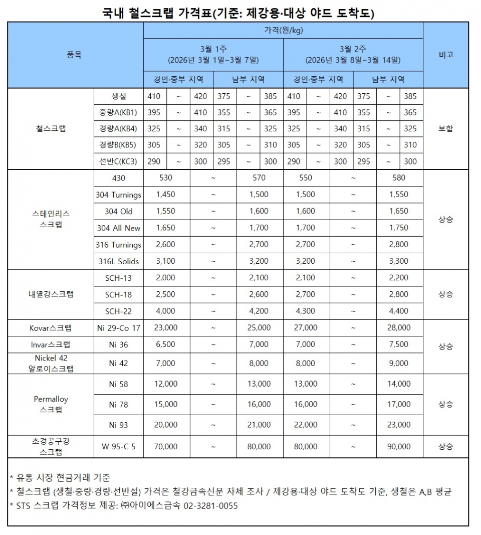 3월 둘째 주 경인·중부권 철스크랩 가격은 제강사들의 특별구매 연장으로 강보합을 이어갔다. 남부권도 지난주 일부 제강사들의 특구 재개가 있었으나 큰 변동 없이 강보합을 유지했다.