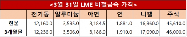 런던금속거래소(LME) 지난달 31일(현지시간) 기준 전기동 현물과 3개월물은 각각 톤당 12,160달러와 12,236달러를 기록했으며 알루미늄은 3,585달러와 3,506달러, 아연은 3,184.5달러와 3,186달러로 집계됐다. 연은 1,881달러와 1,910달러, 니켈은 16,860달러와 17,090달러, 주석은 45,610달러와 46,000달러를 나타냈다.